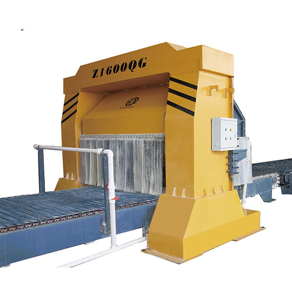 首先是通過Z1600QZ流水線切割機,進行第一次成品切割,Z1600QZ流水線切割機是采用金剛石刀頭,德國進口鋼片制成的刀片精致而成經(jīng)久耐用。進行完第一次流水線切割后,通過90翻轉機對坯體進行水平方向90度旋轉,改變切割方向。再通過扳倒機對改變過方向的坯體進行翻倒,然后輸送給Z800QG切割機,進行第二次成品切割。